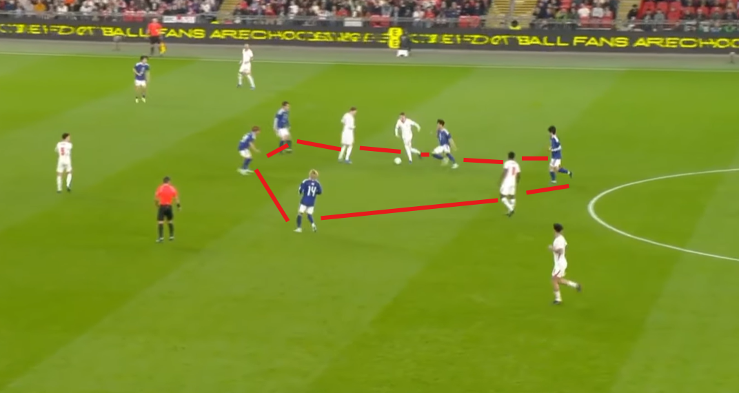 Doan can then pick out a pass to J. Ito, who has a lot of space to take Mainoo on in the 1 v 1 (Figure 6). Japan clearly sought to isolate these 1 v 1 situations, as they trust their winger or wingbacks to beat their man and deliver or shoot. England’s defensive shape completely was outmanoeuvred by intelligent movement off the ball and quick interchanges.