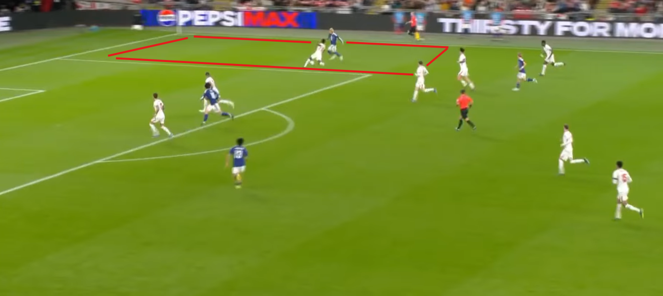 Japan are able to create an abundance of space for Nakamura, isolating Konsa into a 1v1 situation, who Nakamura has the confidence to beat (Figure 9).