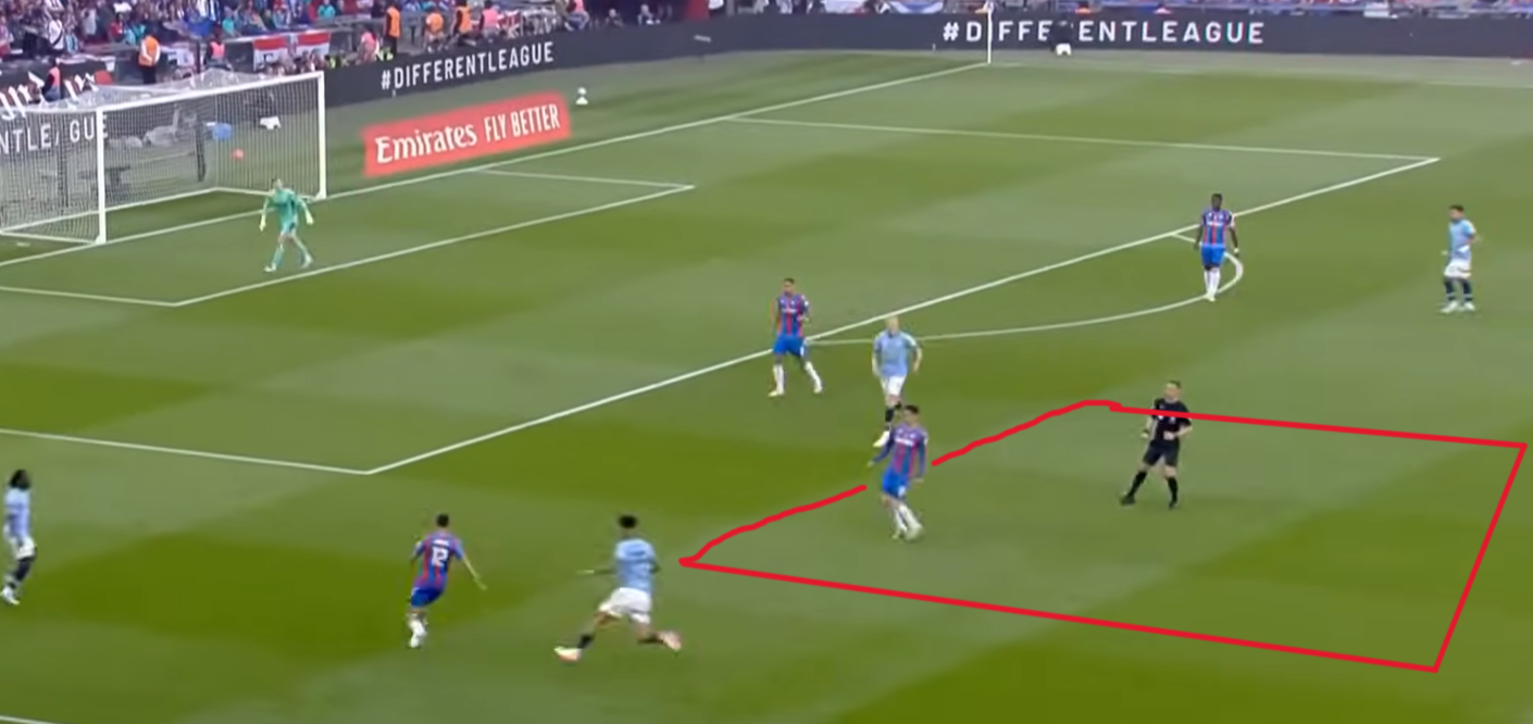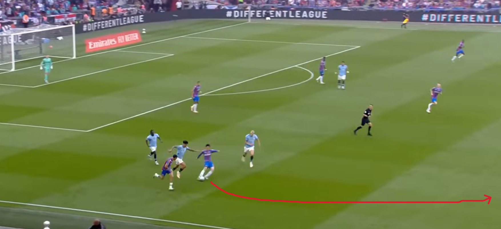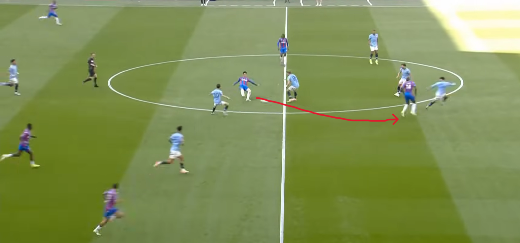 With Man City pressing so high, Richards (RCB) goes direct to Mateta shortly after the goal kick, and Mateta holds off Gvardiol before laying the ball off to Kamada. Kamada had found space to receive the ball behind Bernardo Silva and Kevin De Bruyne, before playing a first time pass back to Mateta to allow Mateta to turn and taking the two Man City midfielders out of the game in the process. The transition from box to box for the goal was extremely efficient and would not have been possible without Kamada’s ability to play quick and in space.